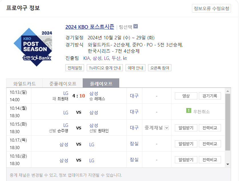 - 3차전: 10월 16일 (수) 오후 6시 30분, 잠실