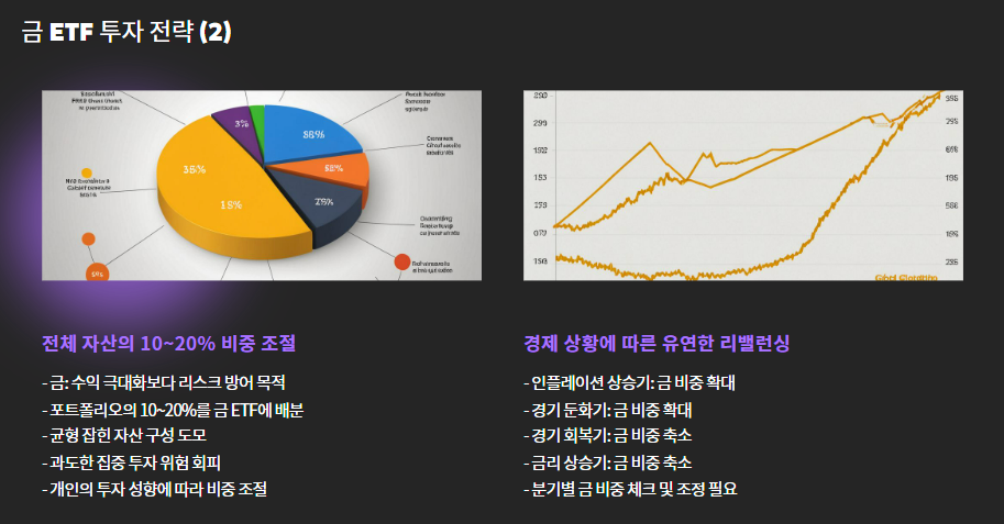 - 포트폴리오의 10~20%를 금 ETF에 배분하면 균형 잡힌 자산 구성이 됩니다.