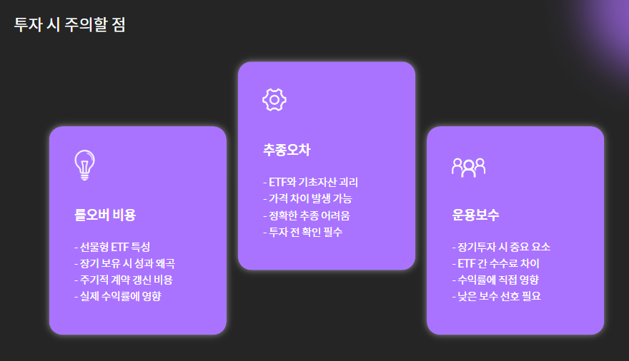 - 선물형 ETF는 롤오버 비용 발생 가능성 → 장기 보유 시 성과 왜곡 주의