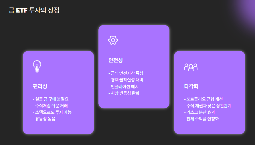 금 ETF 투자는 편리하고 안전하게 금에 투자할 수 있는 똑똑한 방법입니다.