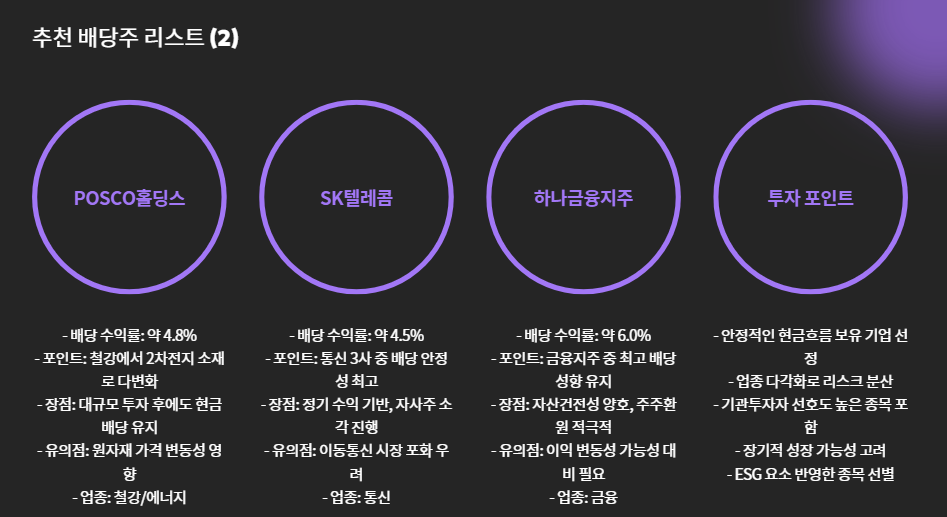 이번 글에서는 ‘배당 수익률 + 안정성 + 성장성’을 종합 고려한 추천 배당주 리스트 8선을 소개하며, 종목별 투자 포인트와 주의사항까지 정리해드립니다.