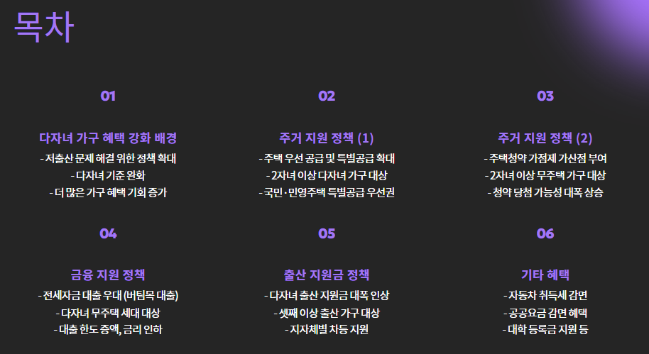 자녀 수에 따른 주거, 금융, 교육 지원이 더 많아지고, 더 쉽게 받을 수 있게 된다는 얘기입니다.