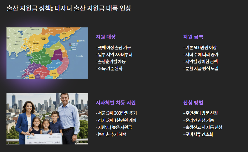 | 출산지원금 | 셋째 이상 출산 시 500만 원 이상 | 지자체별 신청 |