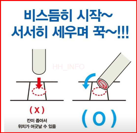 - 살짝 비스듬하게 시작해 점차 수직으로 세우며 눌러주세요.