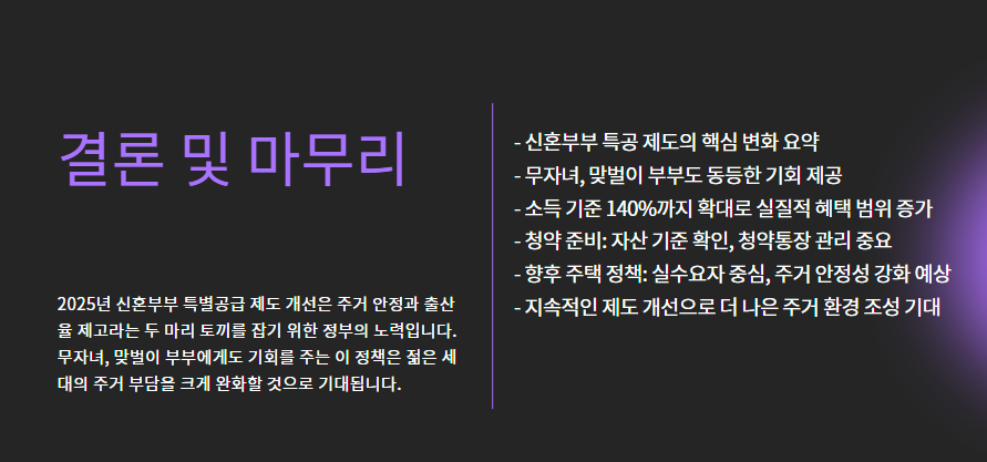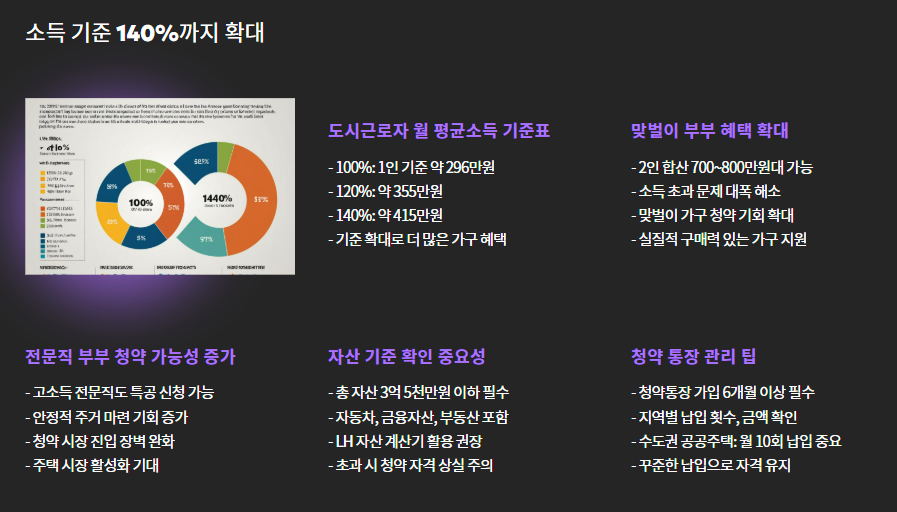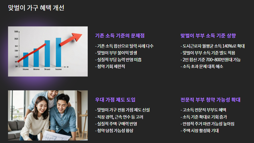 - 맞벌이 부부를 위한 소득 기준 상향 + 우대 가점 도입