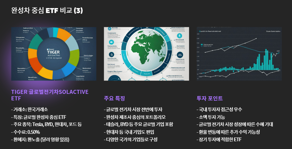 | TIGER 글로벌전기차 | 완성차 집중 | Tesla, 현대차 | 한국 | 0.50% |