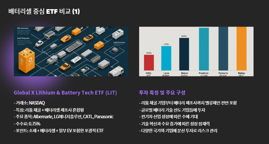 | 글로벌 분산 + 셀 제조사 포함 | LIT | 광물부터 셀, EV까지 포함 |