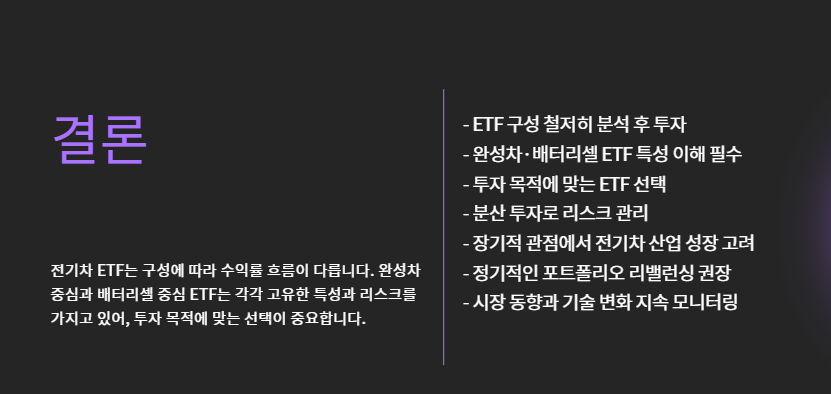 - 전기차 ETF는 그 안에 어떤 기업이 들어 있느냐에 따라 수익률 흐름이 다릅니다.