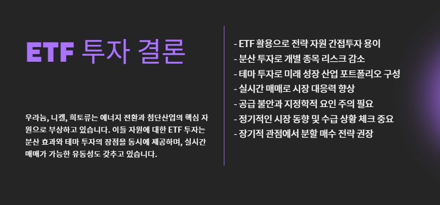 → ETF를 활용하면 분산 + 테마 투자 + 실시간 매매가 가능합니다. - 단, 이들 자산은 공급 불안·지정학적 요인에 매우 민감하므로