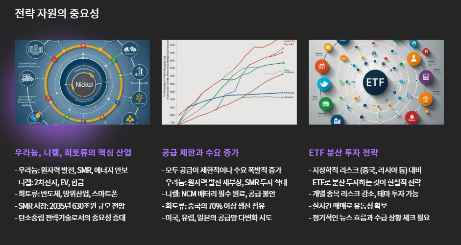 - 우라늄, 니켈, 희토류는 에너지 전환과 첨단산업의 핵심 자원입니다.