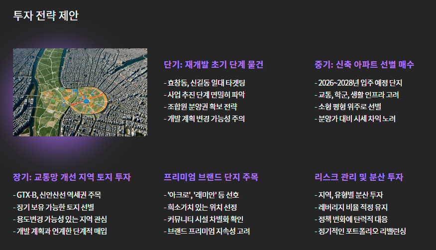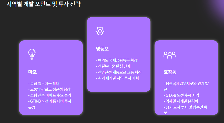 | 효창동 | 용산국제업무지구 연계, GTX-B 수혜 | 장기 토지 투자 및 초기 입주권 확보 |