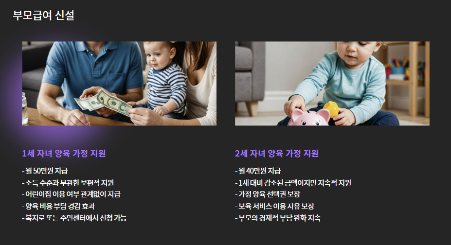 | 부모급여 | 1세 50만 원, 2세 40만 원 | 복지로 |