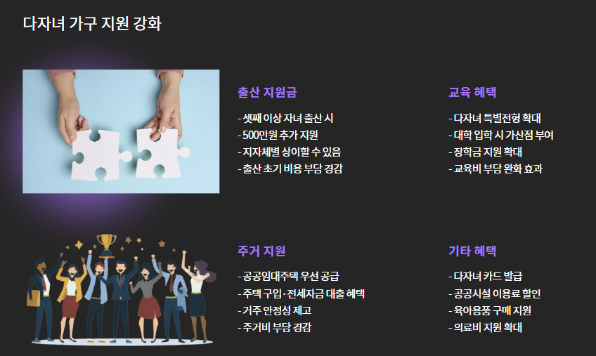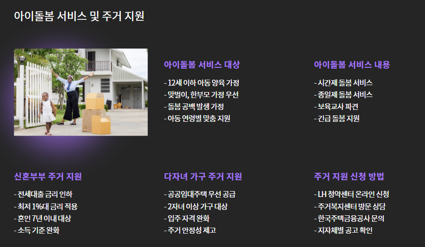 | 다자녀지원 | 출산지원금, 주택 우선 공급 | 지자체, LH |