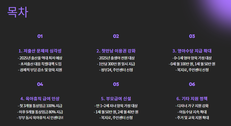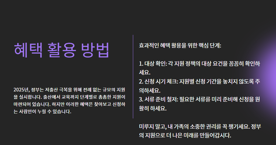 출산 → 육아 → 주거 → 교육까지 단계별로 촘촘한 지원이 준비되어 있습니다.