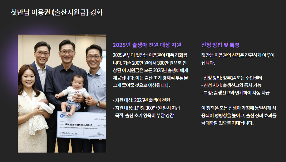 | 첫만남 이용권 | 출생아 1인당 300만 원 지급 | 정부24, 주민센터 |