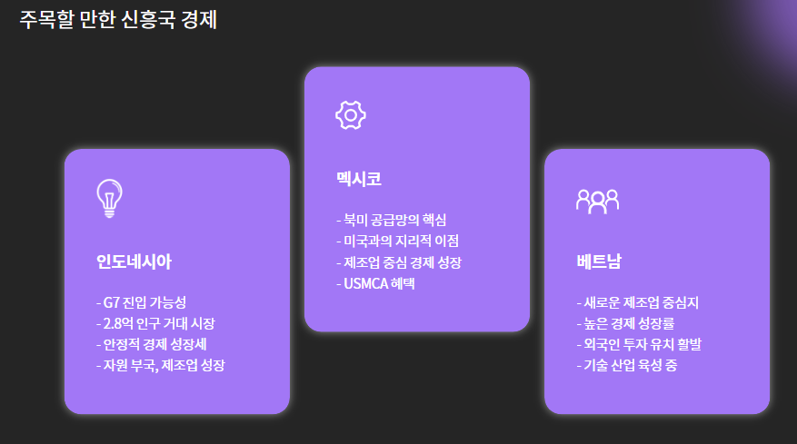 - 인도네시아: 인구 2.8억, 안정적 성장으로 2030년까지 G7 진입 가능성 거론