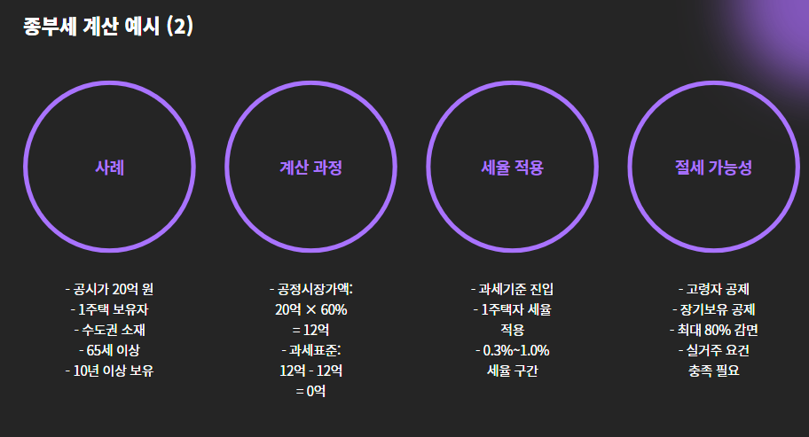 - 다주택자 및 일반 보유자: 합산 6억 원 초과 시 과세