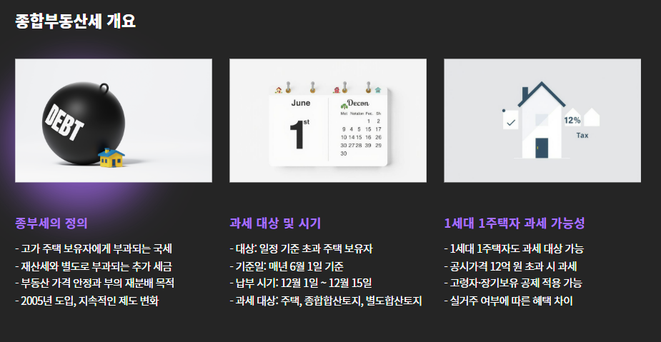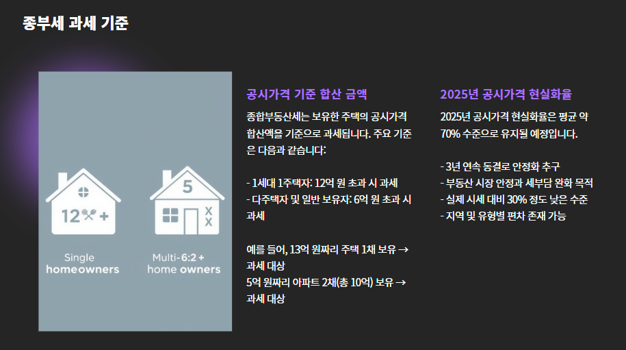 종합부동산세는 일정 기준을 초과하는 주택 보유자에게 부과되는 세금입니다.