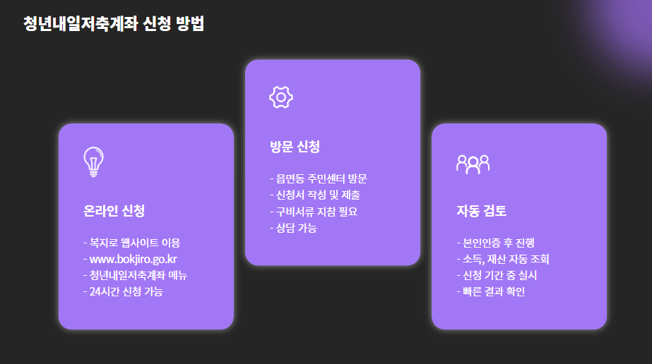- 복지로(www.bokjiro.go.kr) → 청년내일저축계좌 메뉴에서 신청
