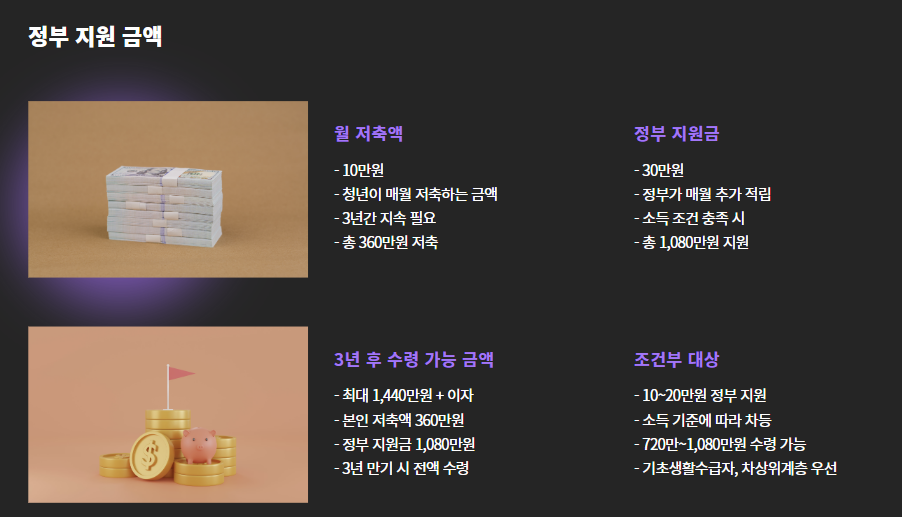 정부가 청년들의 자산 형성을 지원하기 위해 만든 정책인데요, 매월 10만 원 저축 시 정부가 최대 30만 원을 추가로 적립해주는 파격적인 제도입니다.