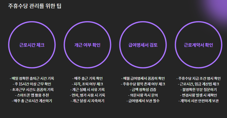 근로시간을 정확히 확인하고, 스케줄 조정할 때 주휴수당 지급 조건을 염두에 두는 것이 중요합니다.