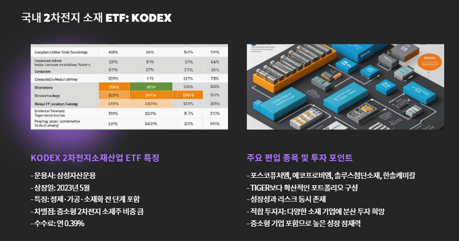 | KODEX 2차전지소재산업 | 국내 | 중소형+전방위 소재 | 0.39% | 다소 높음 |