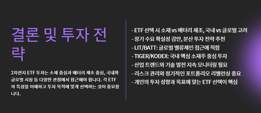 - LIT/BATT은 글로벌 밸류체인 접근, TIGER/KODEX는 국내 핵심 소재주 중심으로 이해하면 됩니다.
