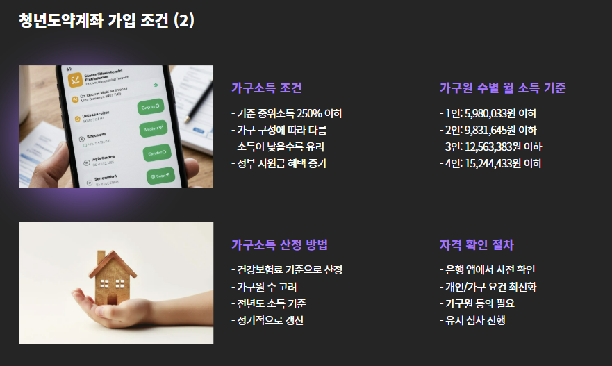 가구소득은 건강보험료 등을 기준으로 산정되며, 정확한 자격은 은행 앱을 통해 미리 확인 가능하다.