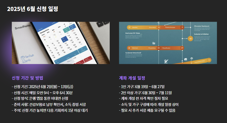 | 계좌 개설 일정 | 1인 가구: 6월 19일 ~ 6월 27일 / 2인 이상 가구: 6월 30일 ~ 7월 11일 |