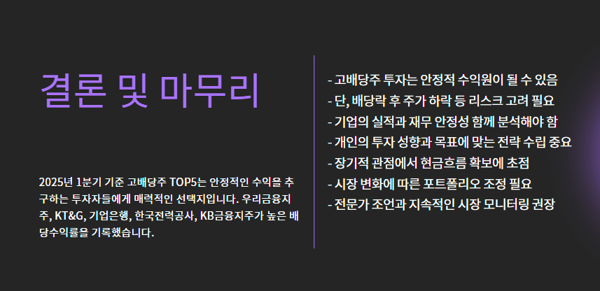 - ⚠️ 고배당이라도 주가가 지속 하락하면 실질 수익 감소