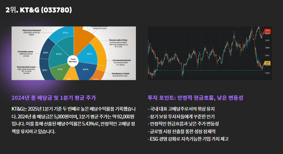 이 종목들은 배당금 지급이 꾸준하고, 실적 기반도 탄탄한 대표적인 안정형 투자처입니다.