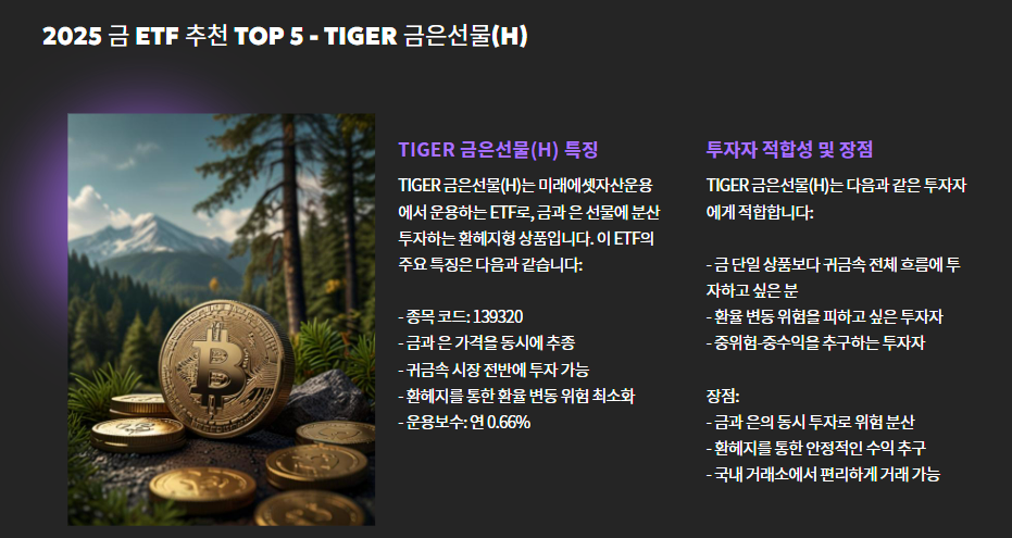 | TIGER 금은선물(H) | 국내 | 있음 | 금 + 은 | 0.66% | 중 |