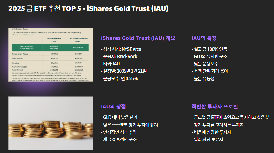 | iShares IAU | 미국 | 없음 | 실물 금 | 0.25% | 중상 |