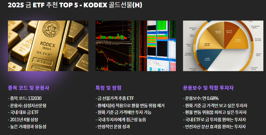 - 특징: 금 선물가격을 추종하는 국내 대표 ETF, 환헤지(H) 적용