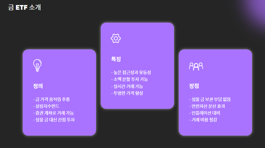 금 ETF는 간편하고 유동성 높은 금 투자 수단입니다.