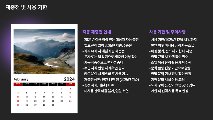 - 2024년 이용 이력이 있는 대상자는 2025년 자동 충전 대상