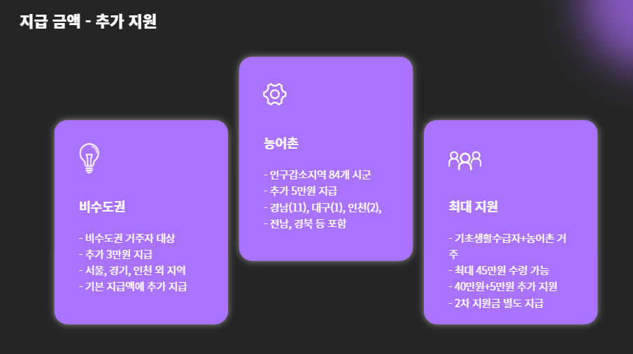 - 농어촌 인구감소지역 주민(84개 시군): 추가 5만 원