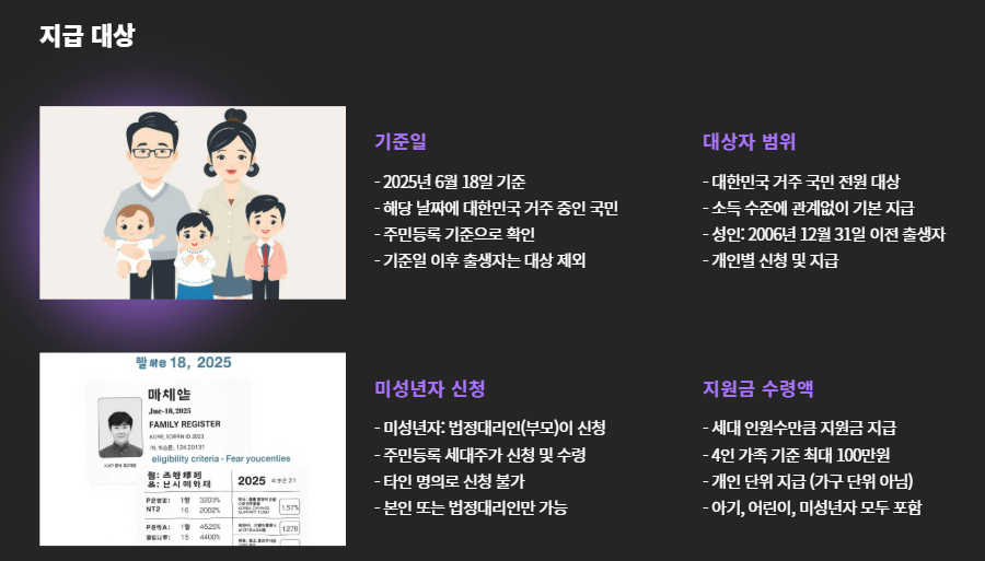 특히 아동과 미성년자도 지급 대상에 포함되어 있기 때문에, 가구 인원이 많을수록 실질적인 수혜 금액이 커지는 구조입니다.