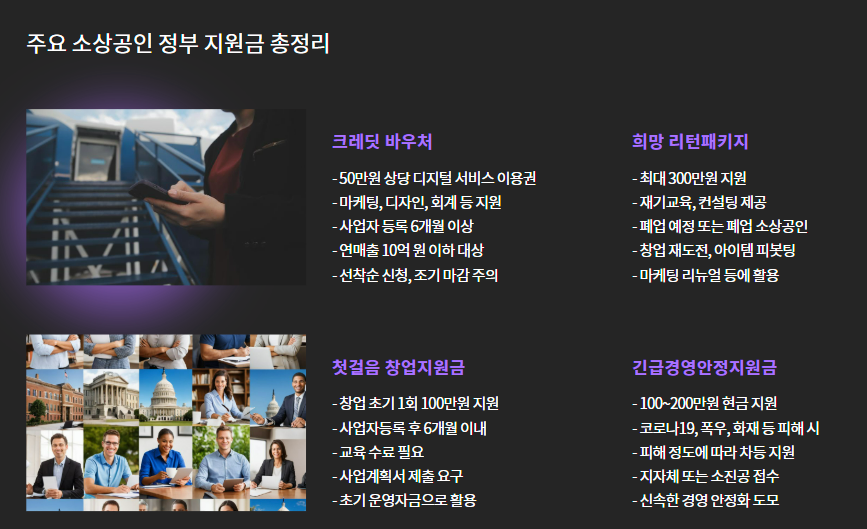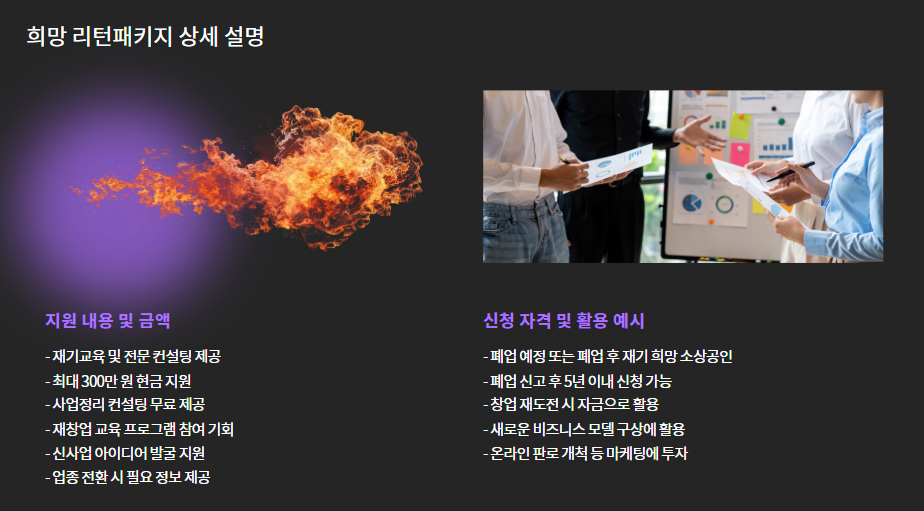 | 희망 리턴패키지 | 최대 300만 원 | 현금 + 컨설팅 | 폐업 예정 또는 초기 회복 소상공인 |