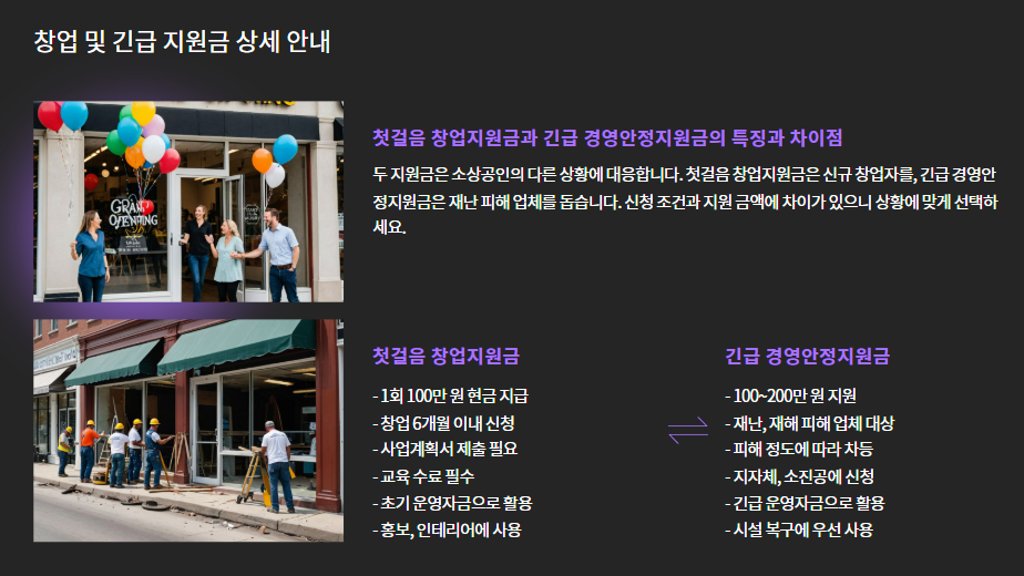 | 첫걸음 창업지원금 | 100만 원 | 현금 지급 | 창업 1년 이내 소상공인 |