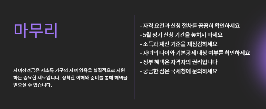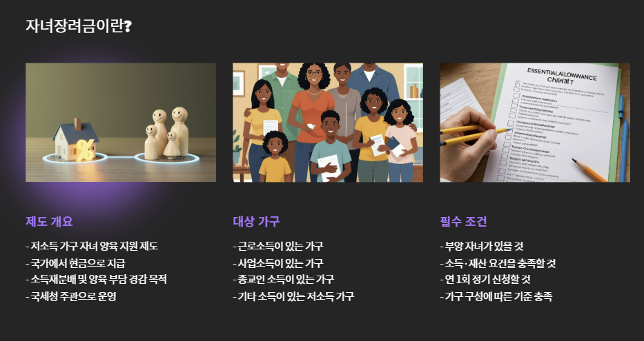 자녀장려금은 소득이 많지 않더라도, 자녀를 양육하고 있는 저소득 가구에 실질적인 도움을 주는 제도입니다.