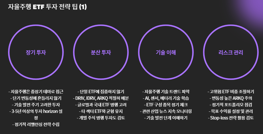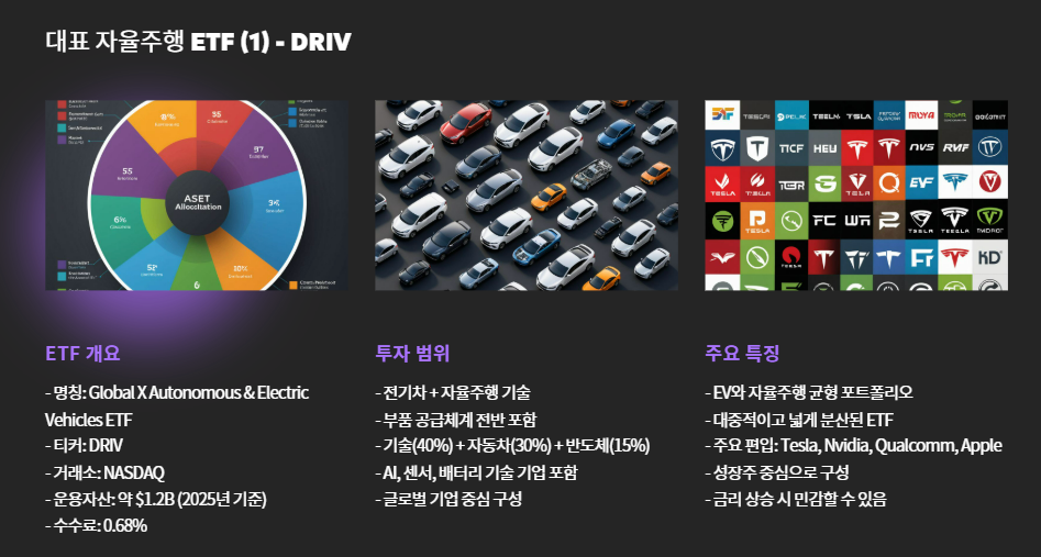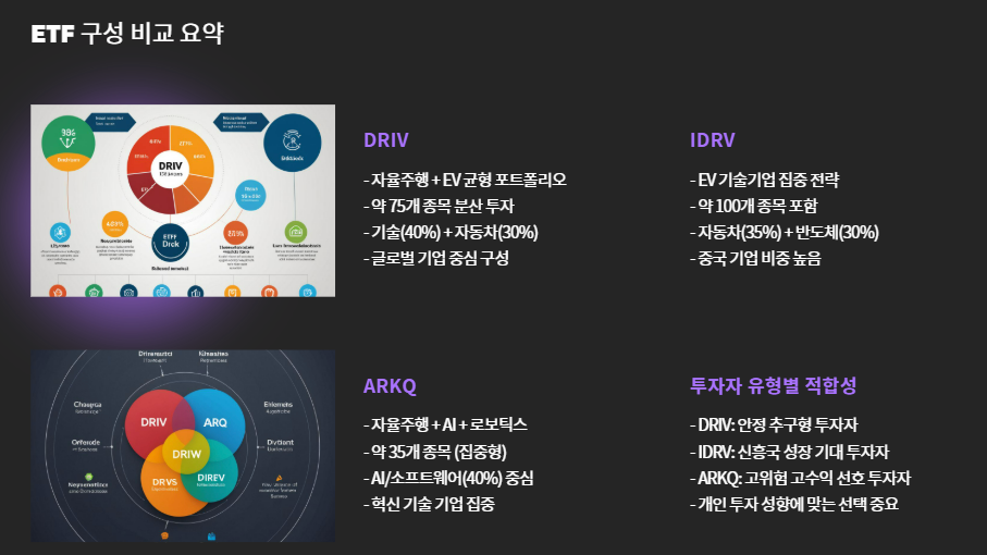 - DRIV: 안정 분산형, IDRV: 신흥국 포함, ARKQ: 공격적 성장 베팅
