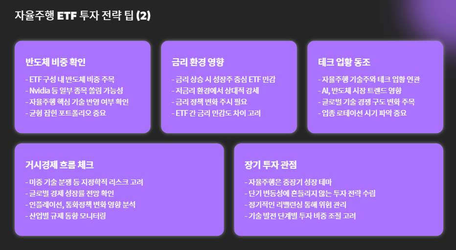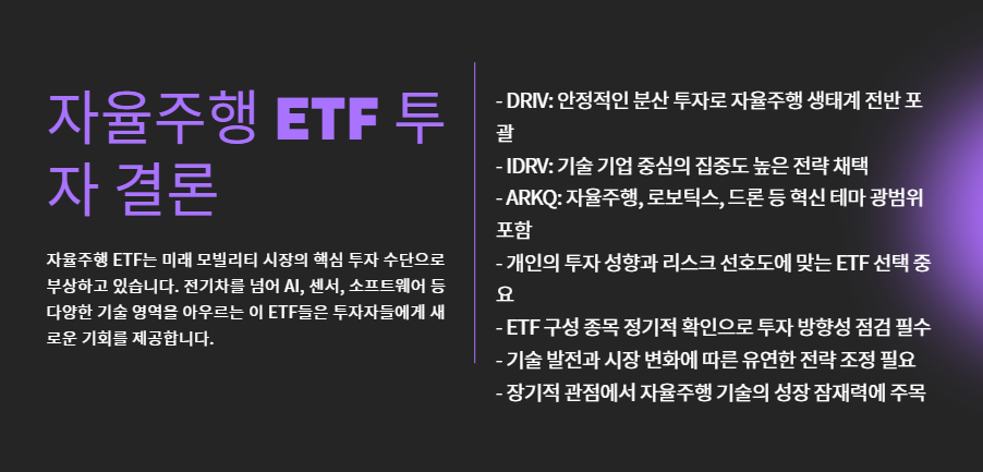 - 자율주행 ETF는 전기차와는 다른 투자 방향과 구성 종목을 가지고 있습니다.