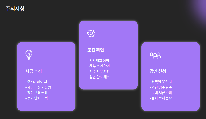 - 감면 적용 받았을 경우 5년 내 매도 시 세금 추징 가능성