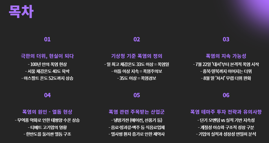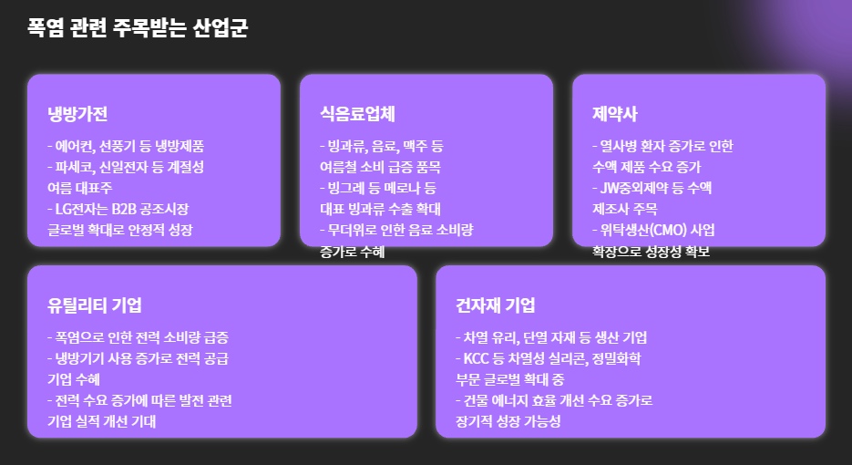 폭염은 국민 건강과 일상에 큰 부담이지만, 시장에서는 이와 같은 현상도 하나의 기회 요인으로 해석됩니다.