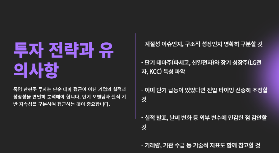 반면, LG전자나 KCC처럼 구조적으로 폭염과 관련된 수요가 계속 발생할 수 있는 기업은 실적의 안정성이 훨씬 높습니다.