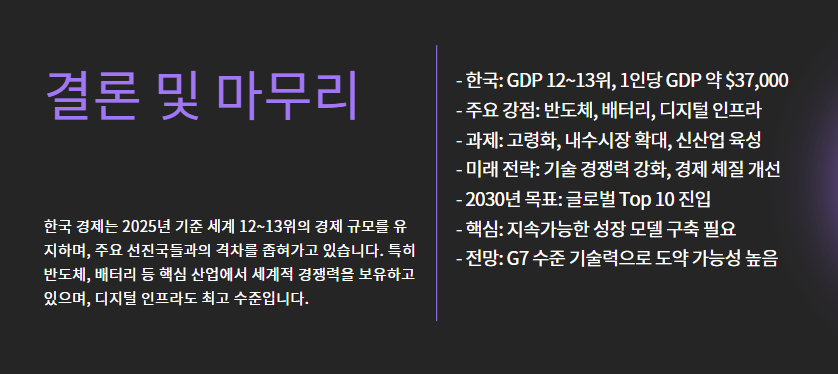 2025년 현재 한국은 전 세계 GDP 기준으로 약 12~13위권을 유지하고 있으며,