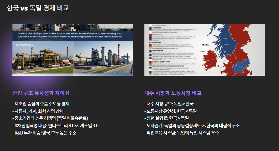 - 한국은 독일과 비슷한 산업 구조지만, 내수·노동시장 유연성은 차이 존재