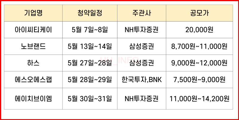 5월 공모주 청약 시장에는 아이씨티케이, 노브랜드, 하스, 에스오에스랩이 코스닥 상장을 위한 기업공개(IPO)에 나선다.▲아이씨티케이(5월7~8일)보안칩 반도체 팹리스 기업 아이씨..