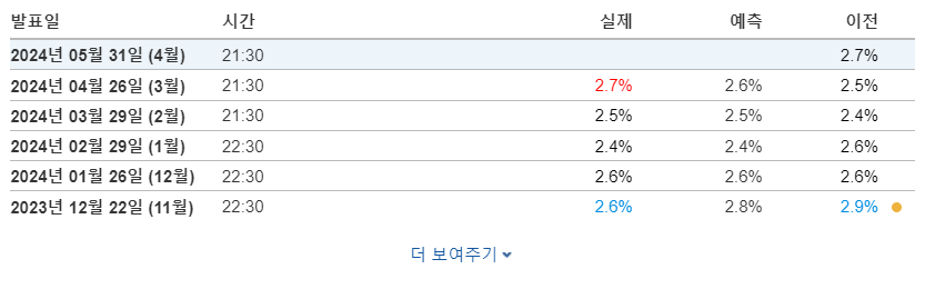 4월 PCE는 한국 시간으로 5월 31일 21시 30분에 발표됩니다. 4월 26일에 발표된 전년 대비 PCE는 2.7%로, 연준의 목표인 2%를 상회했습니다. 이는 미국 증시에 부정적인 영향을 미쳤습니다.